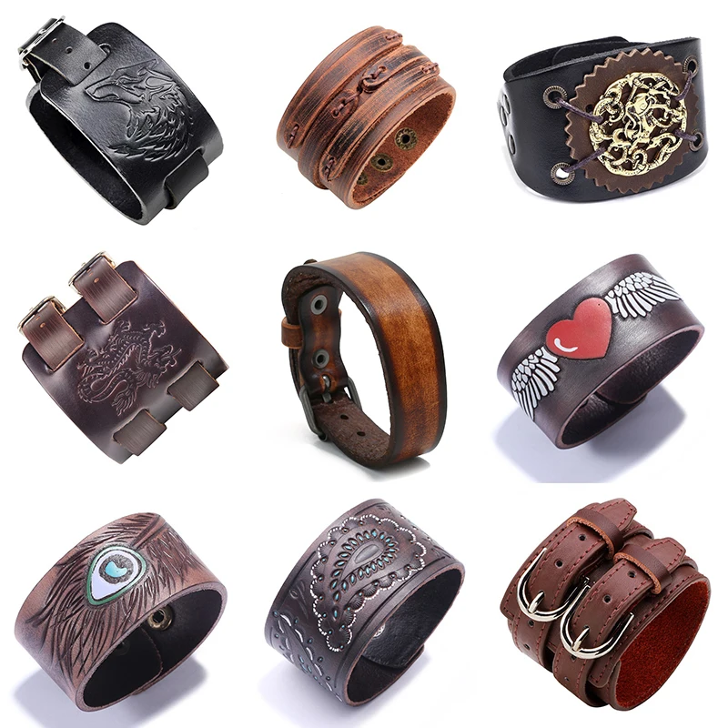 Best 2019 New Black Brown Vintage Genuine Leather Bangles Wide Leather Bracelet For Women Men Bracelet E