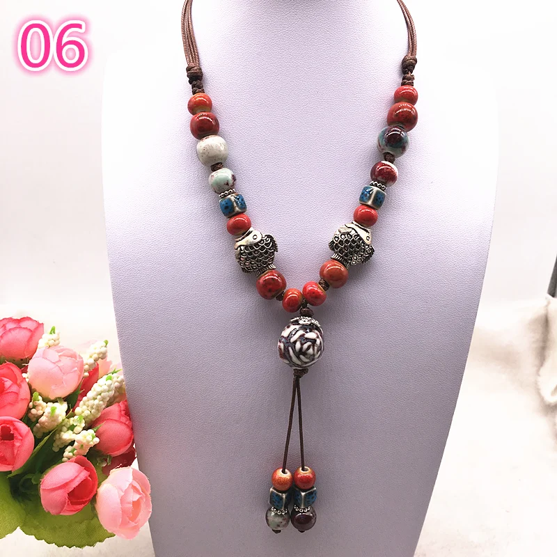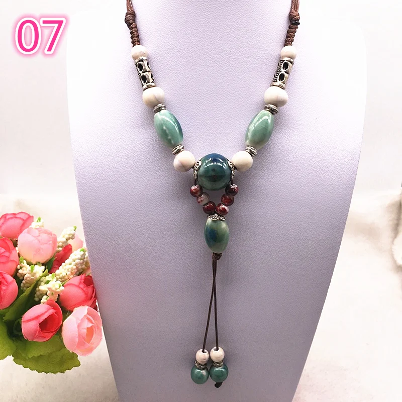 Best Fashion Ethnic Jewelry Traditional Handmade Ornaments Weave Wax Rope Ceramics Necklace Ceramics Bea