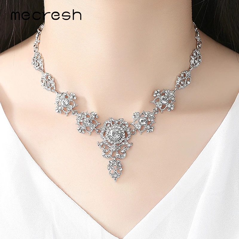 New Mecresh Rhinestone Flower Bridal Jewelry Sets for Women Silver Color Crystal Party Wedding Necklace