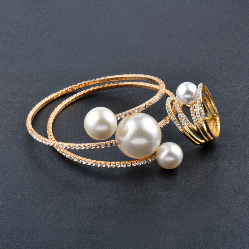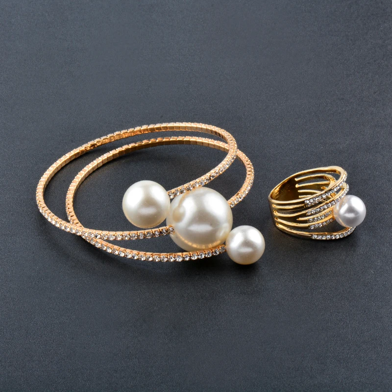 New SINLEERY Wedding Jewelry Sets Big Pearl Multilayer Bracelet Bangle Rings Set For Women Silver Gold
