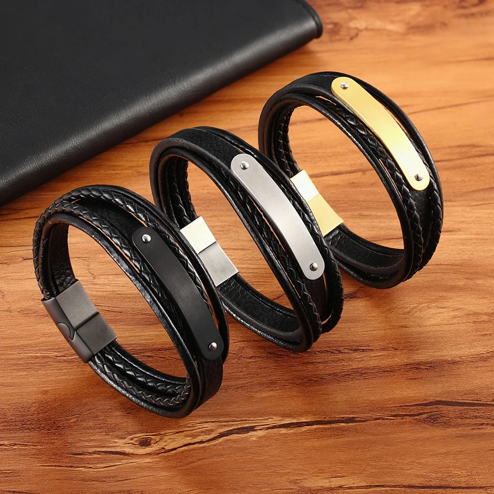 Best Luxury Curved Design Stainless Steel Accessories Magnetic Button Braid Multilayer Genuine Leather B